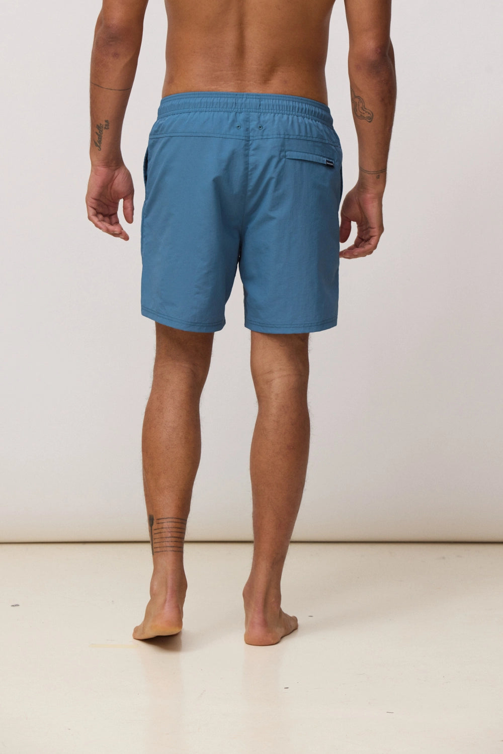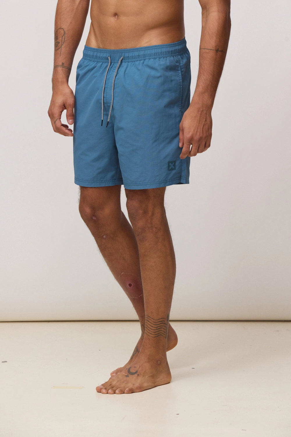 - Straight-cut swim shorts with adjustable elastic waistband with drawstring and custom eyelets