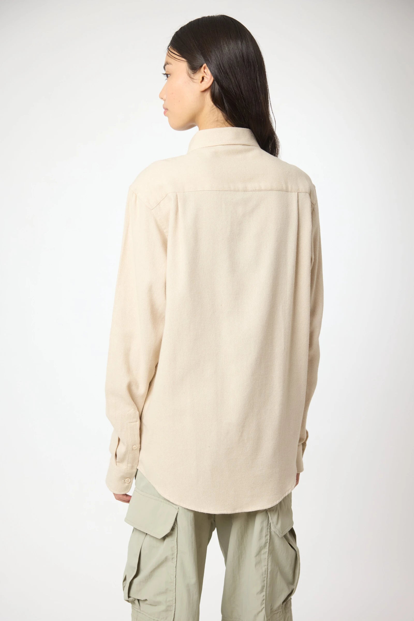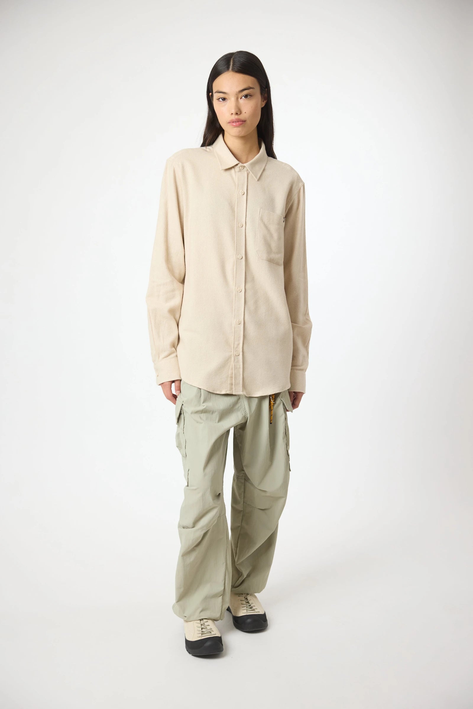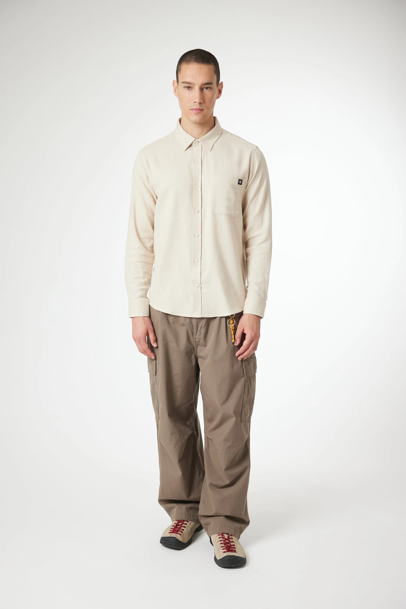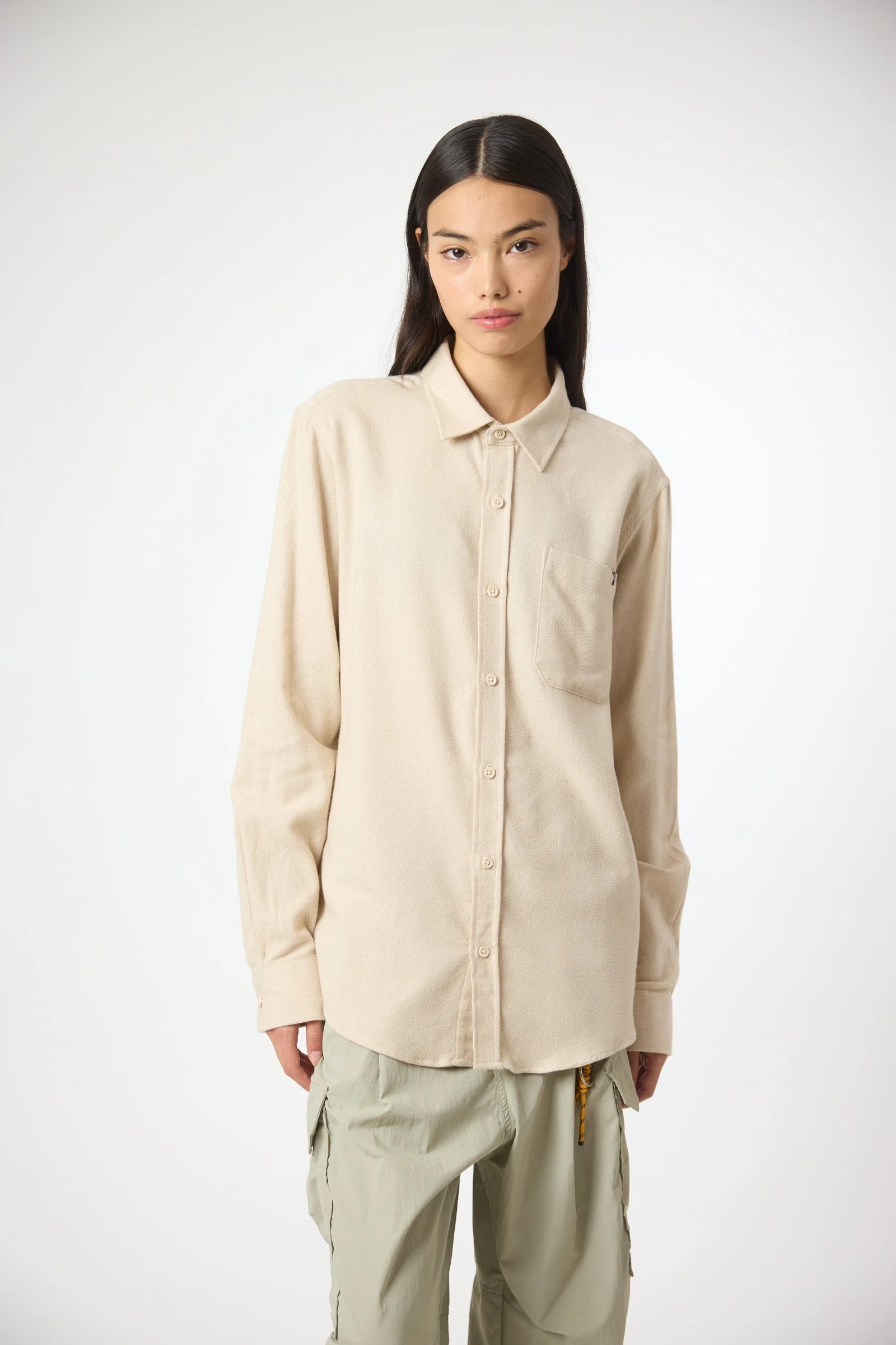 Long sleeve shirt, 100% cotton. One patch pocket on the chest. Forward shoulder seam. Custom buttons. Branding labels on the front pocket and on the side seam.
