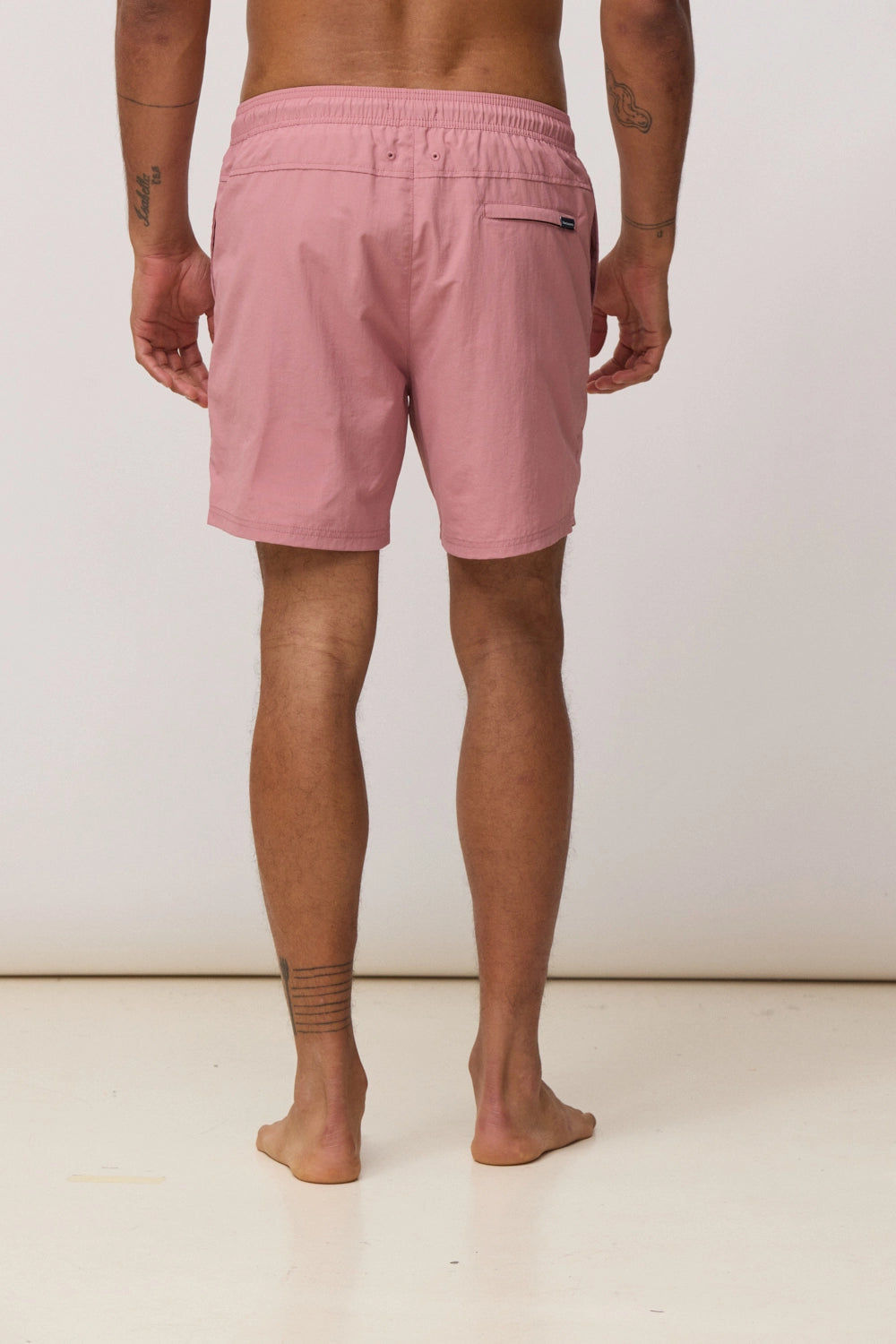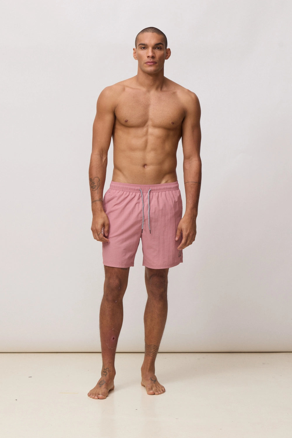 - Straight-cut swim shorts with adjustable elastic waistband with drawstring and custom eyelets