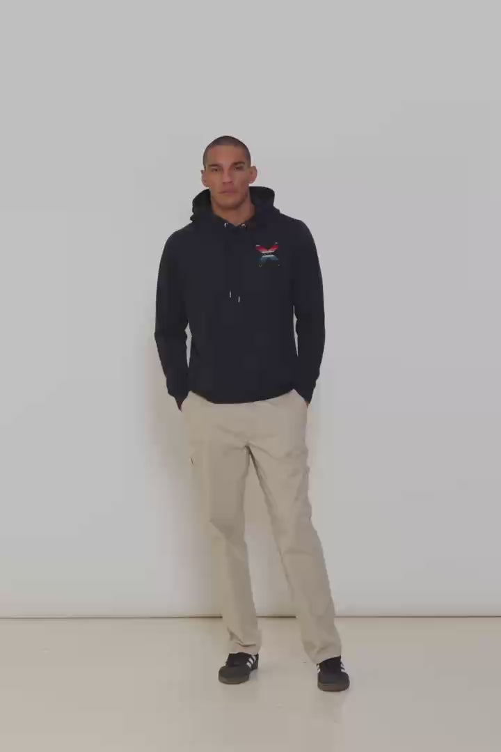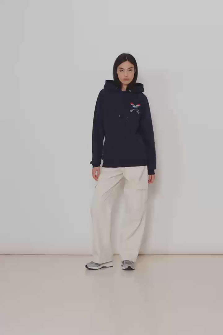 Hoodie with our classic embroidered X: front on the chest and back on the back. Lower central front pocket with opening on both sides. Made with 100% organic cotton and regular fit cut.