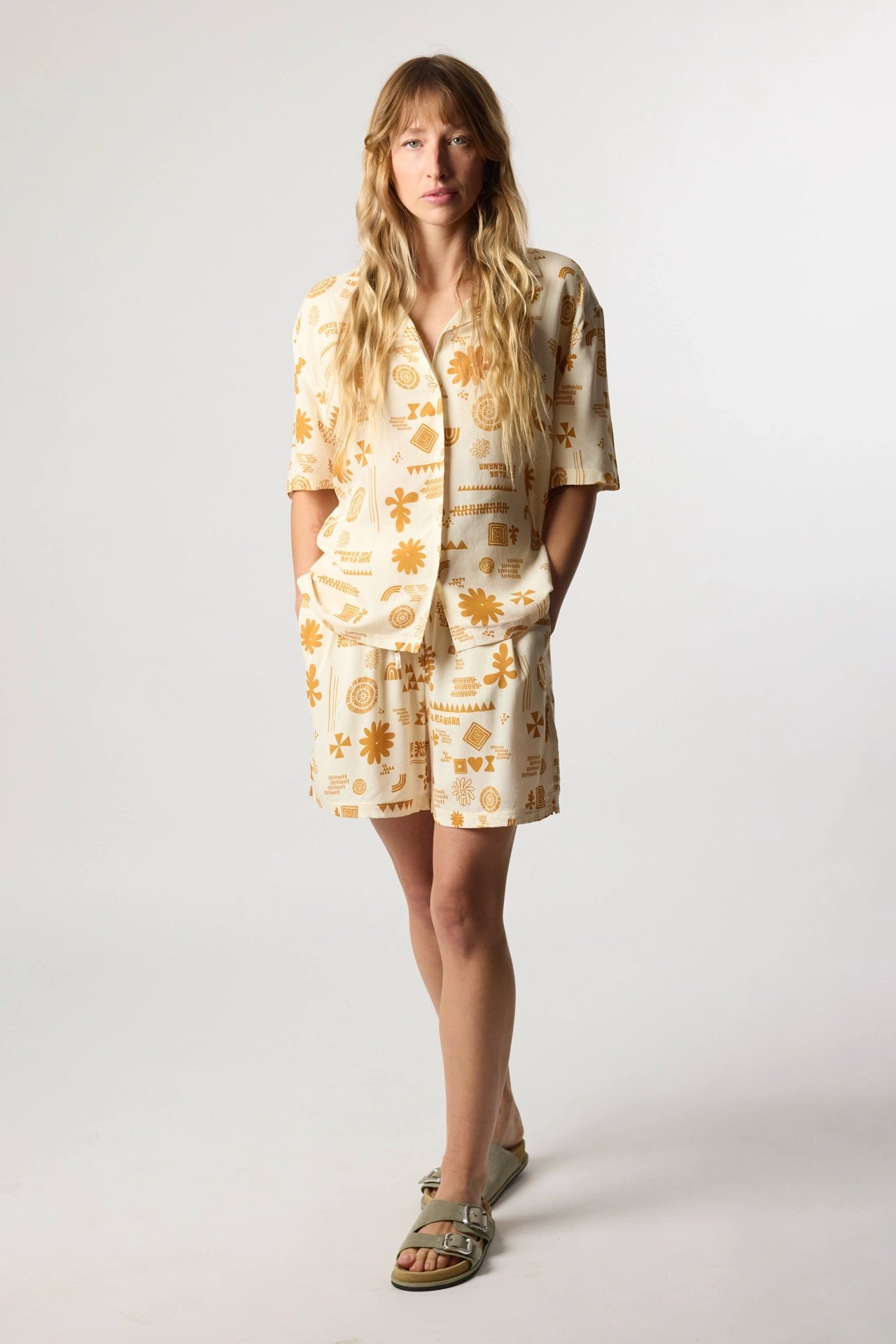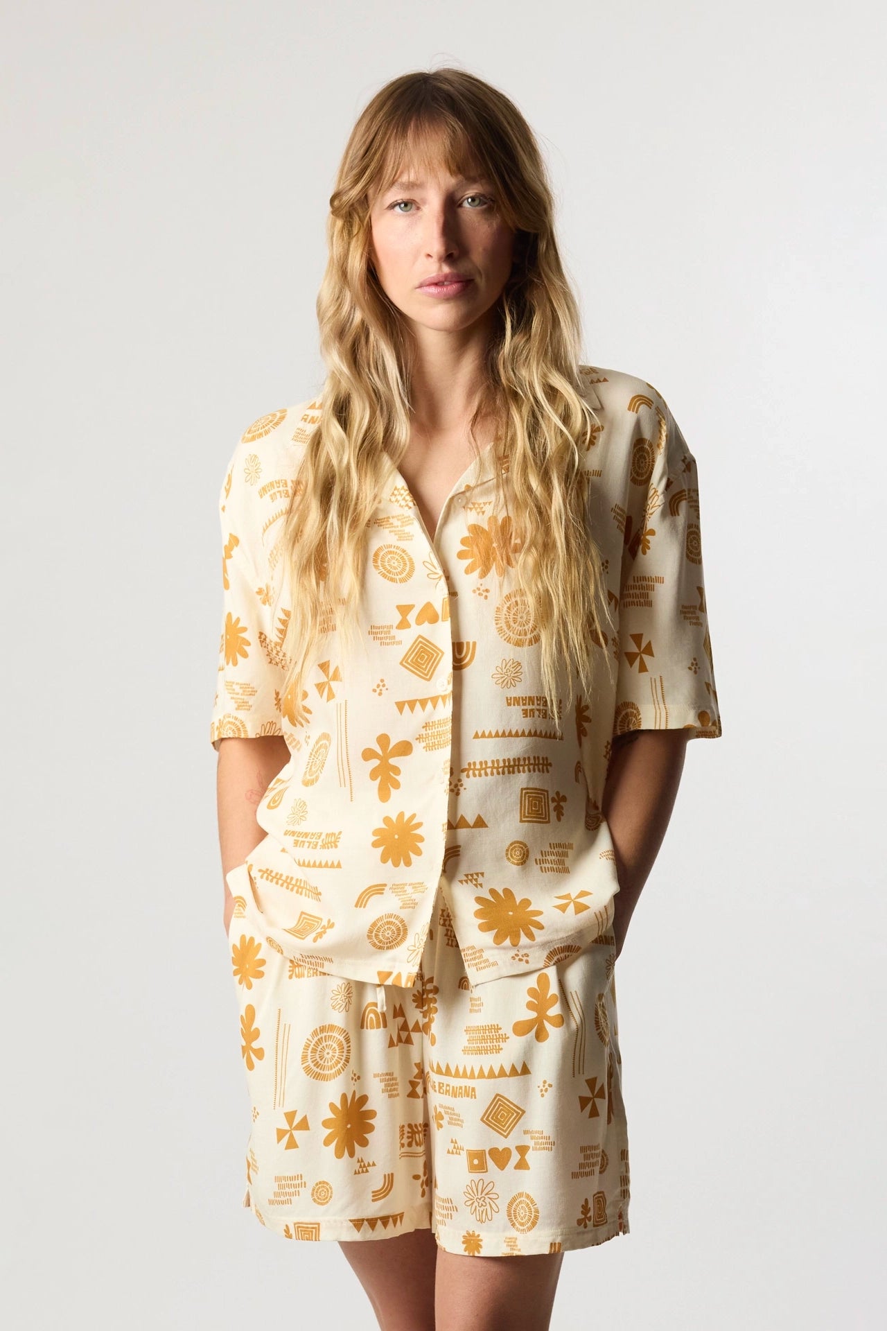 Short-sleeved flowy printed shirt. Made from 100% rayon. Front button closure. Camp collar. Label on the left side.
