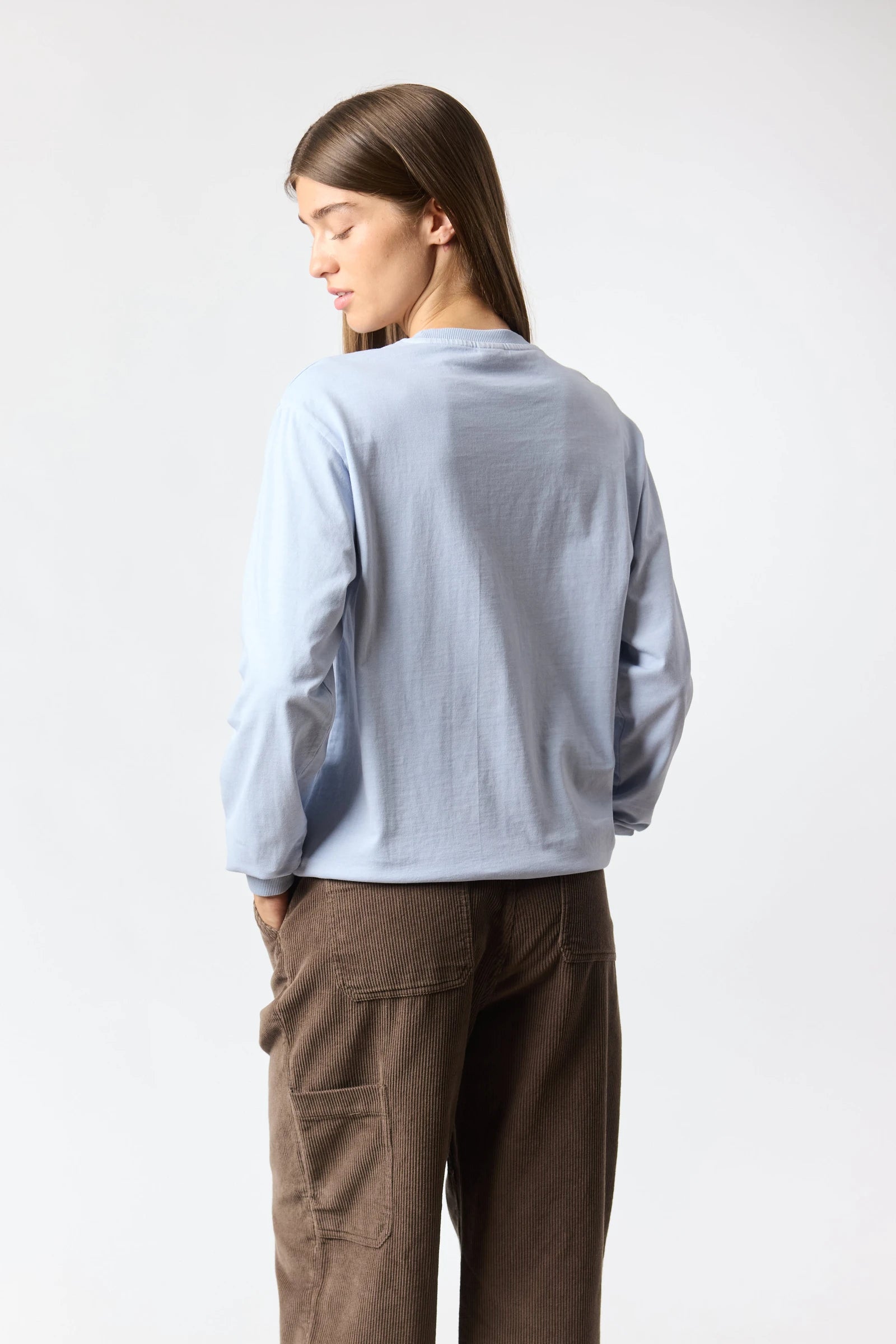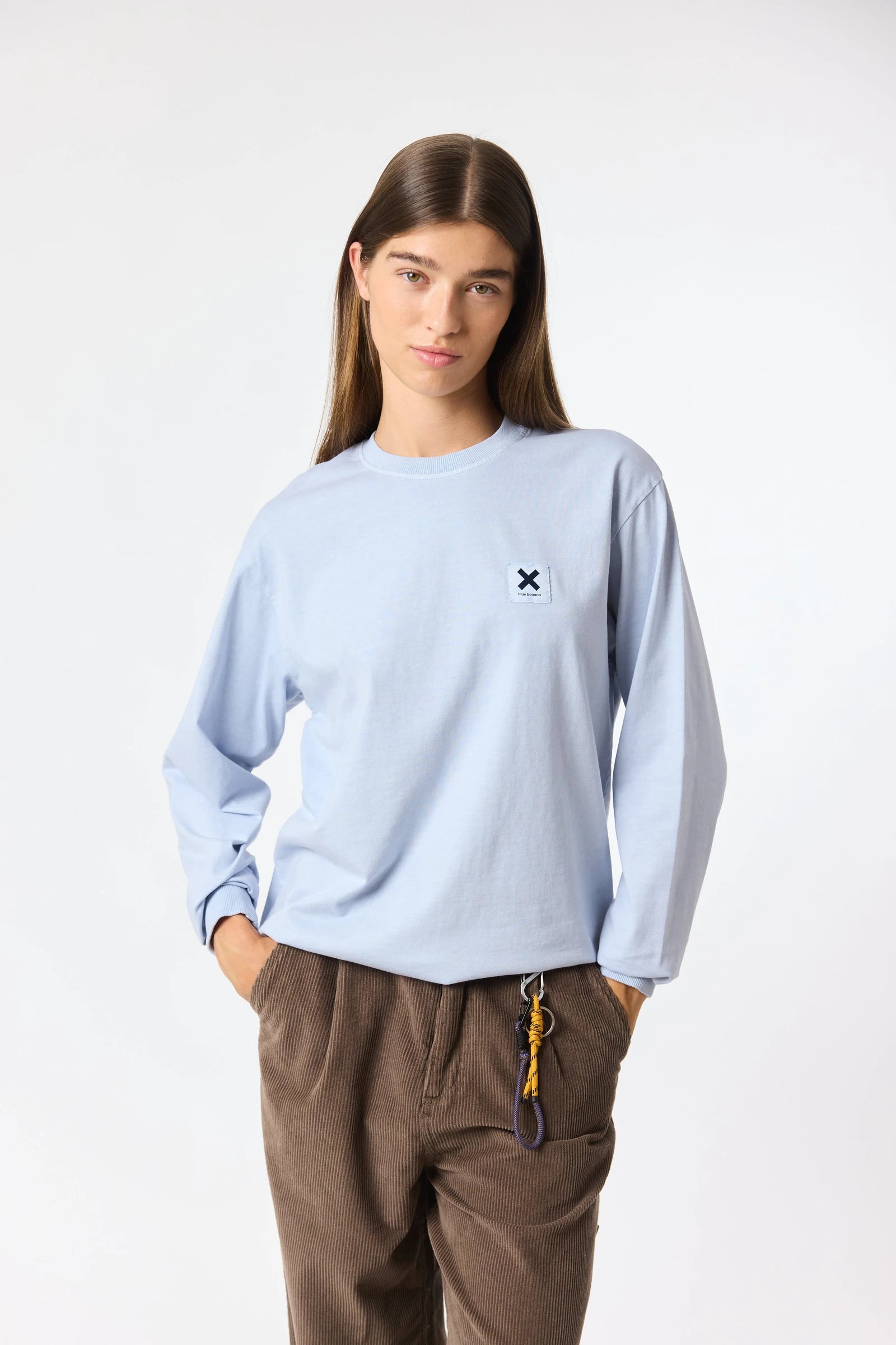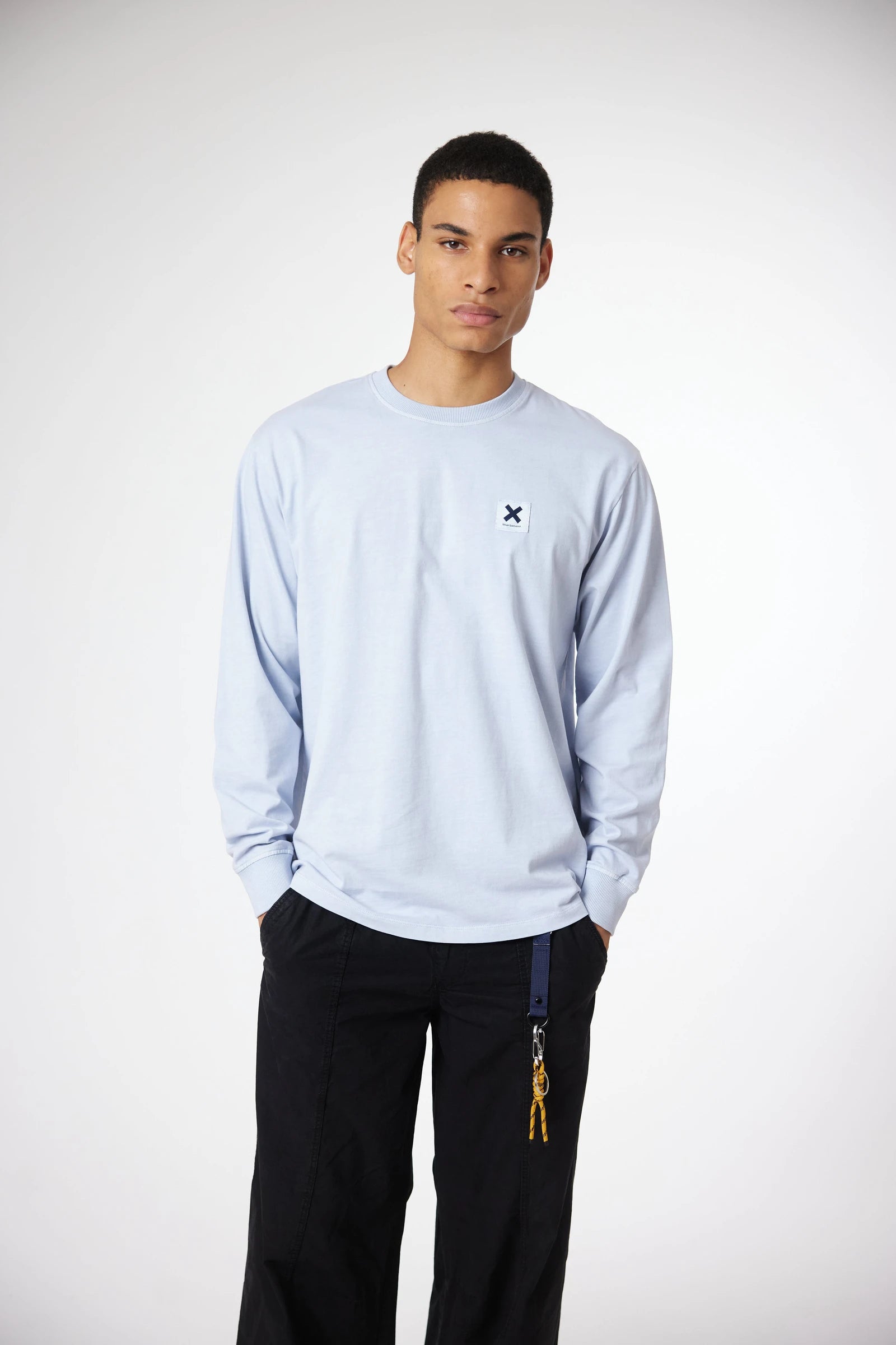 Long sleeve washed-effect t-shirt with a woven label logo on the chest.