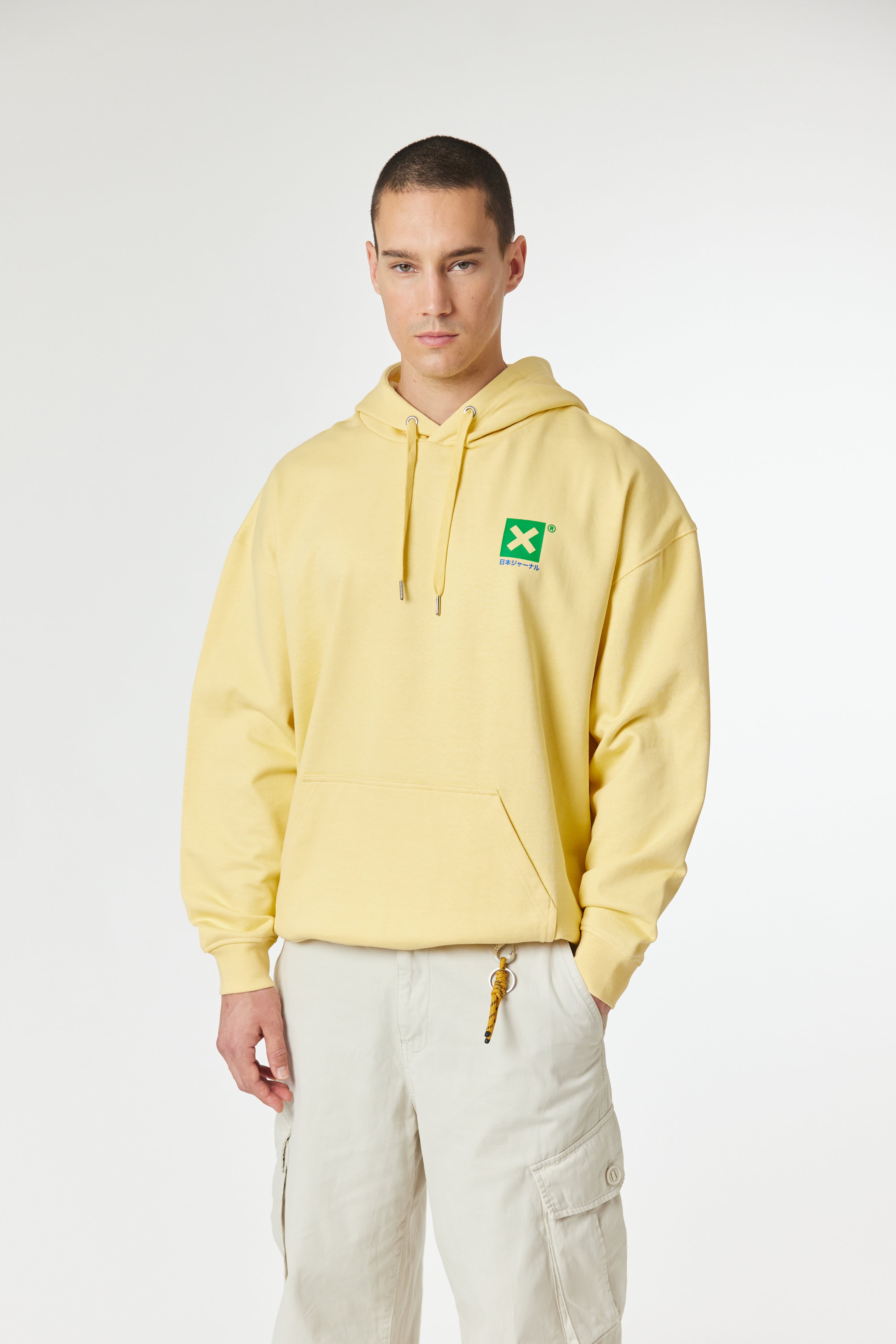 Hoodie with front print on the upper left side and centered back print. Front lower central pocket with openings on both sides. Made of 100% organic cotton and regular fit.