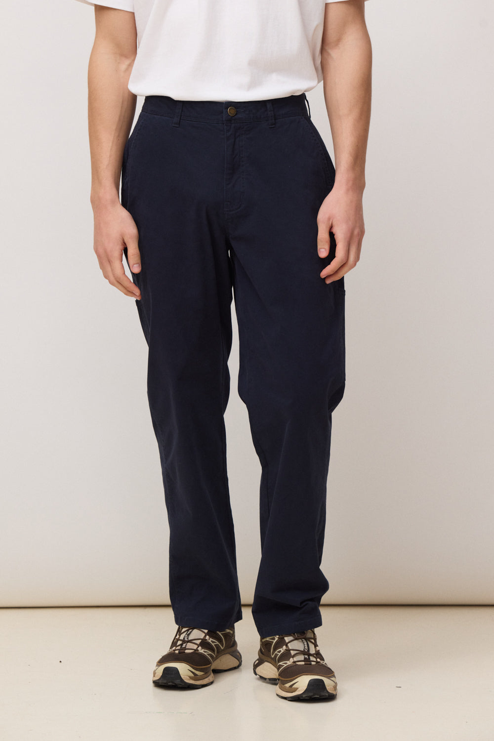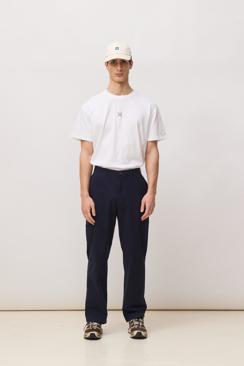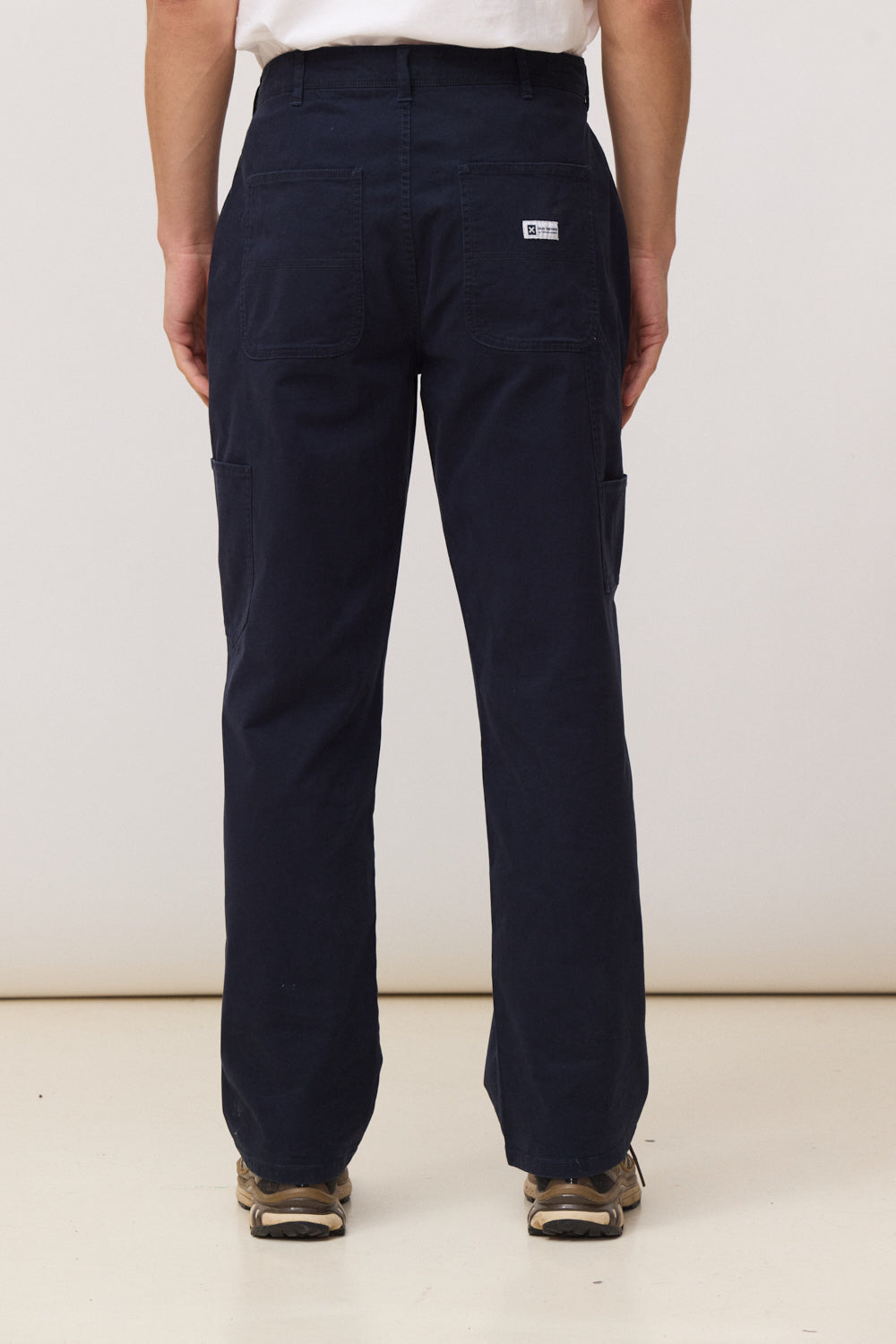 Pantalón largo de corte recto (straight fit). Abertura de cremallera y botón personalizado. Bolsillos diagonales en delantero. Bolsillos traseros con etiqueta decorativa. Detalles de bolsillo estilo "carpenter" en pierna. Etiqueta tejida en la parte trasera. Confeccionado con 97% algodón orgánico y 3% elastano.