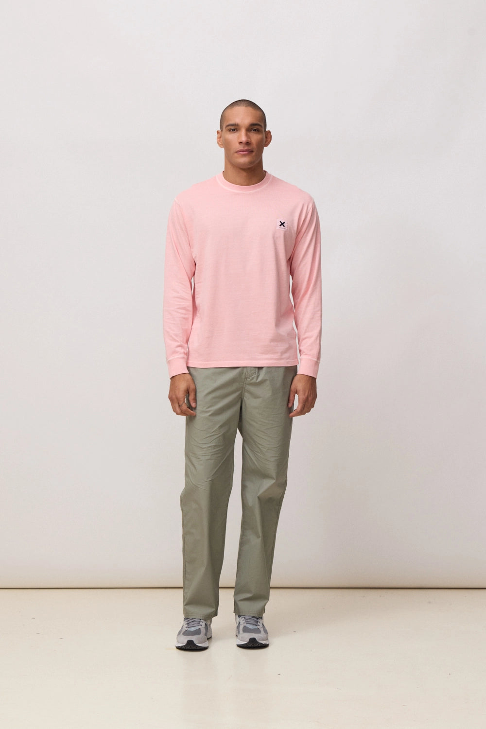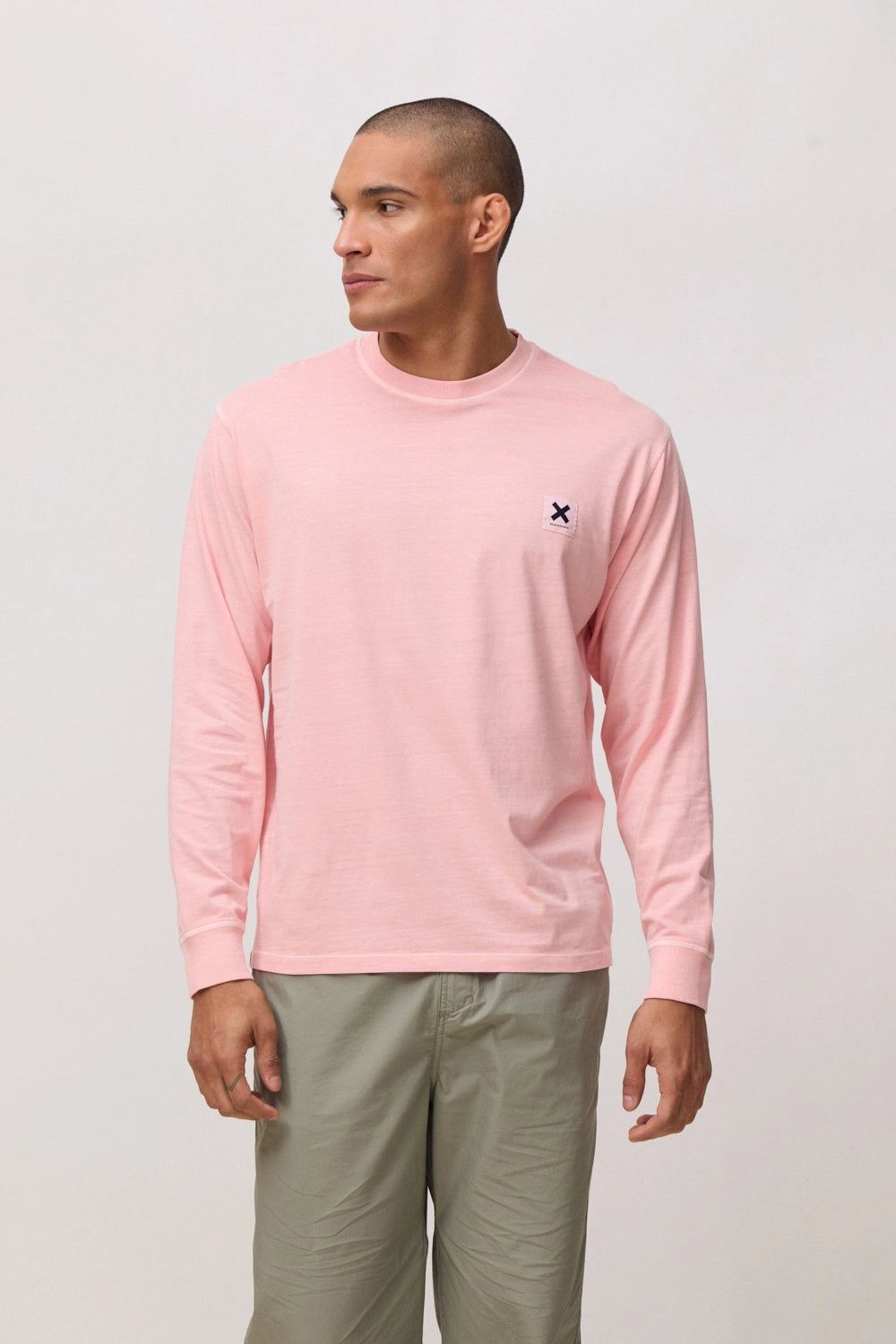 Long-sleeve washed-effect T-shirt with woven label on the front. Logo on woven label. Made from 100% organic cotton. Regular fit with a weight of 240 GSM.