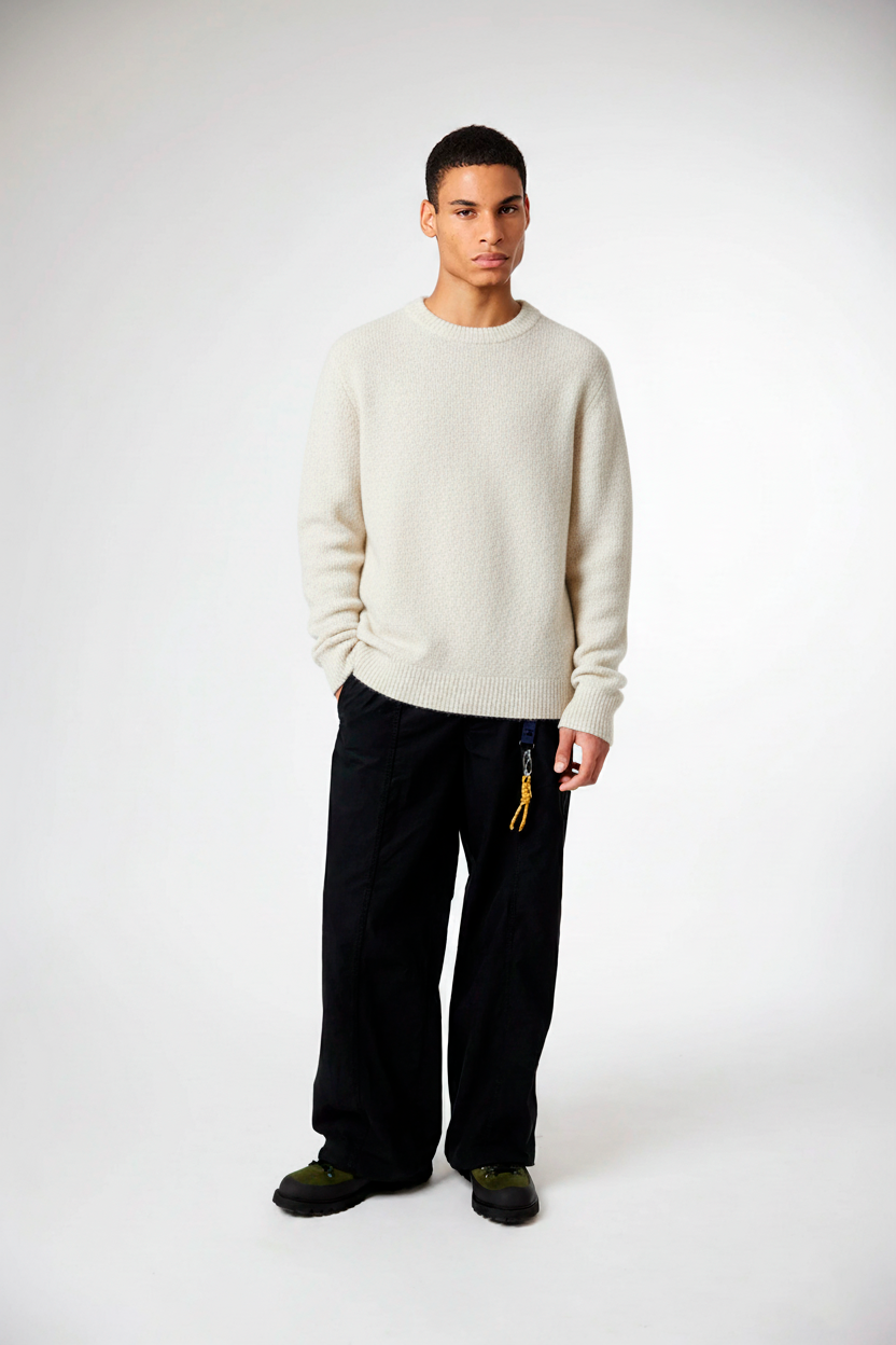 Jersey de punto bouclé, confeccionado en base de algodón. Cuello redondo y acabados en rib. Con etiqueta decorativa de branding en bajo.