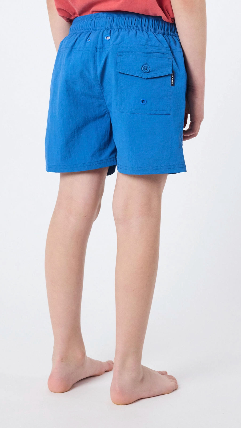 Bañador con corte recto. Cintura elástica, cierre con cordón y herretes engomados. Etiqueta cosida en la parte inferior derecha. Bolsillos laterales delanteros y bolsillo trasero en la parte superior derecha con solapa para el cierre y ojal metálico.