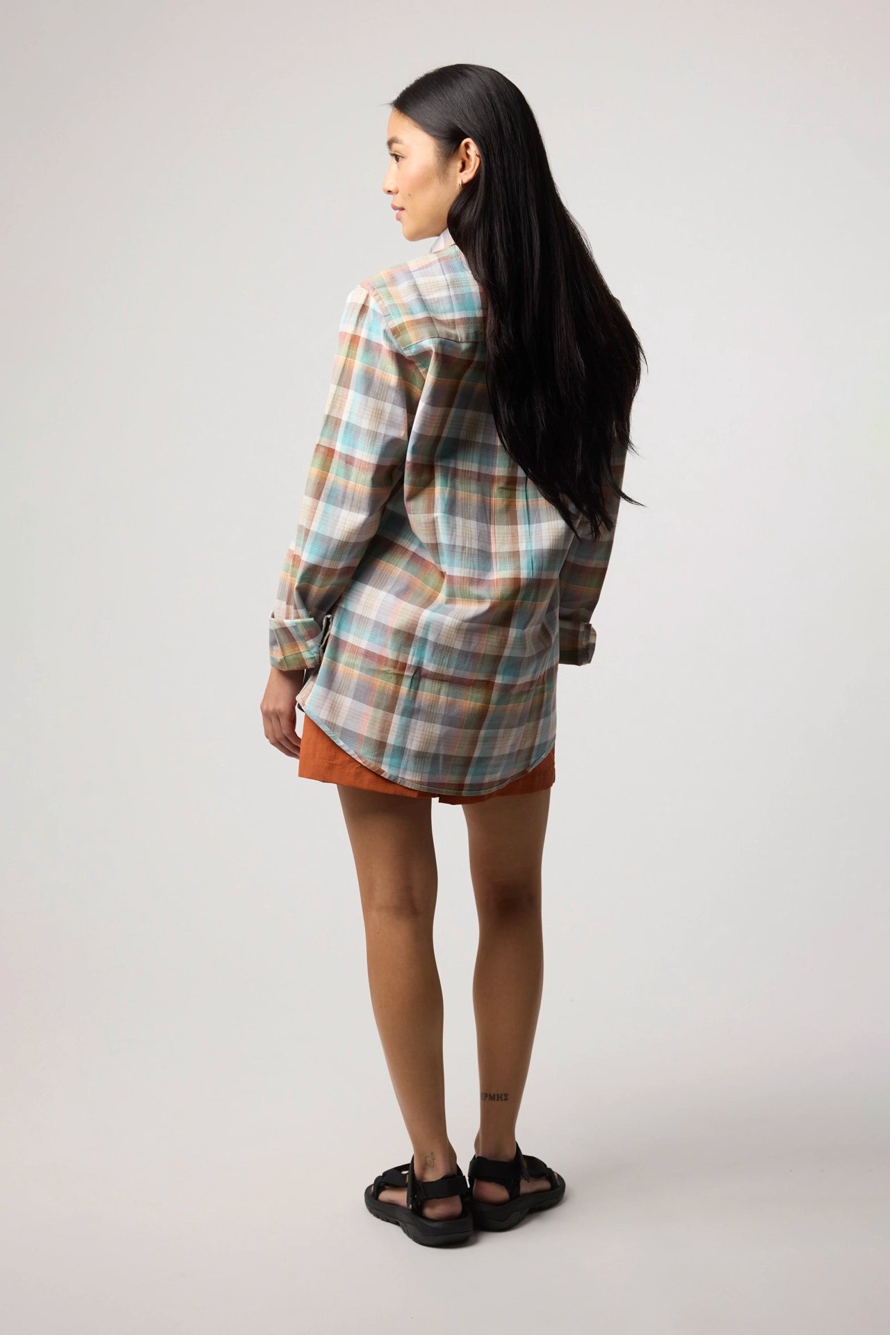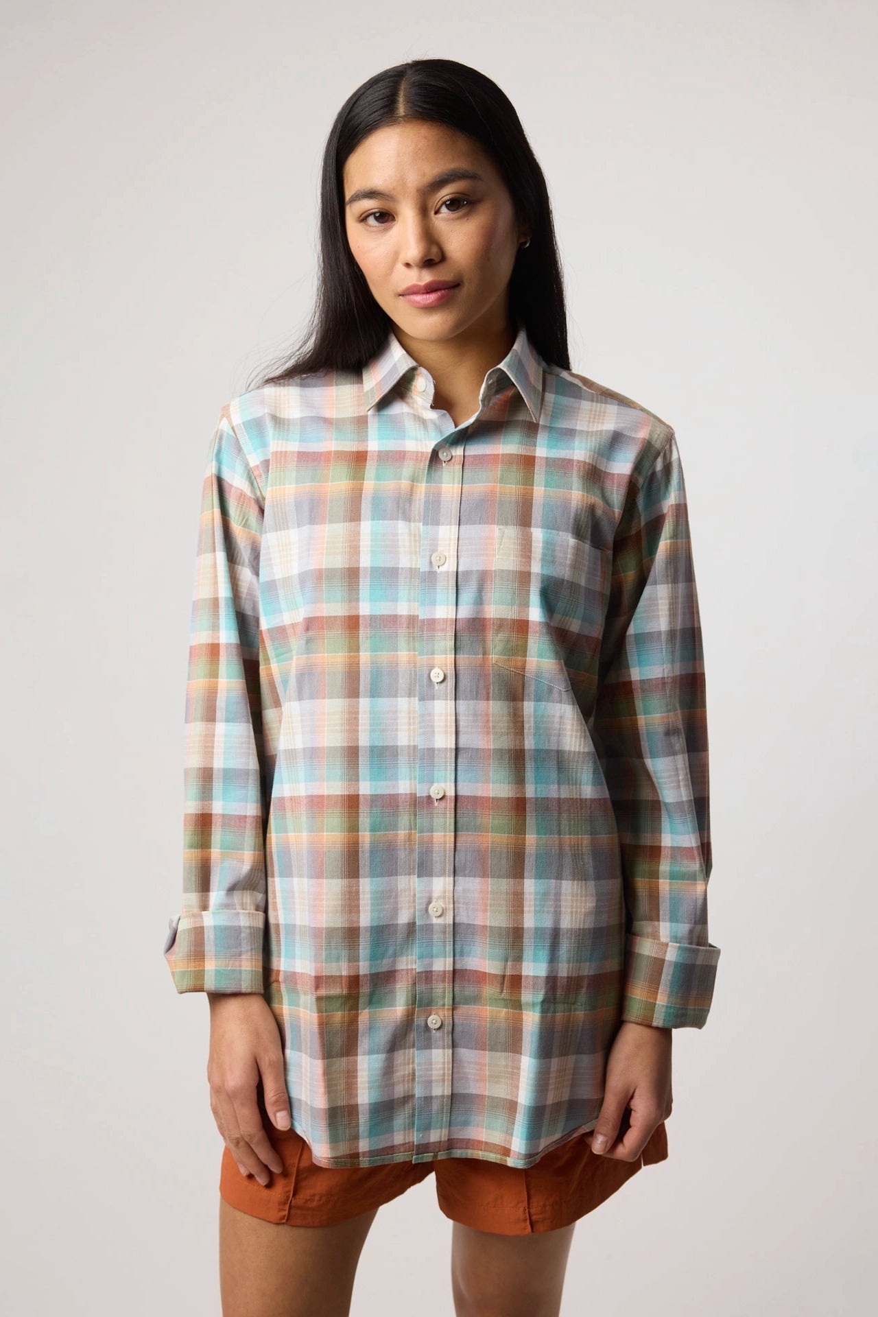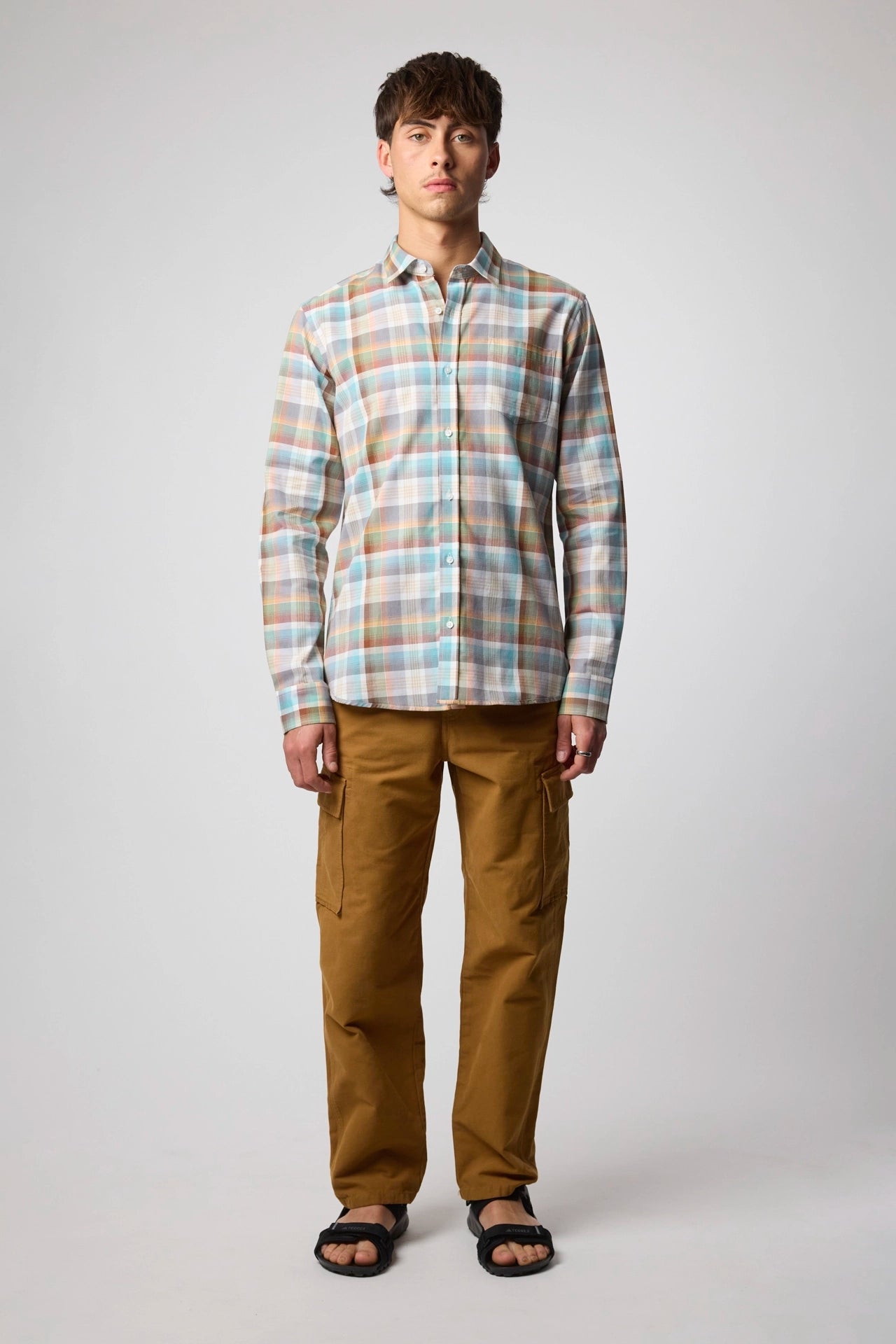 Camisa estampada de algodón 100%, con un bolsillo delantero en el lado izquierdo. Etiqueta con bordado en la parte inferior izquierda. Botones personalizados.