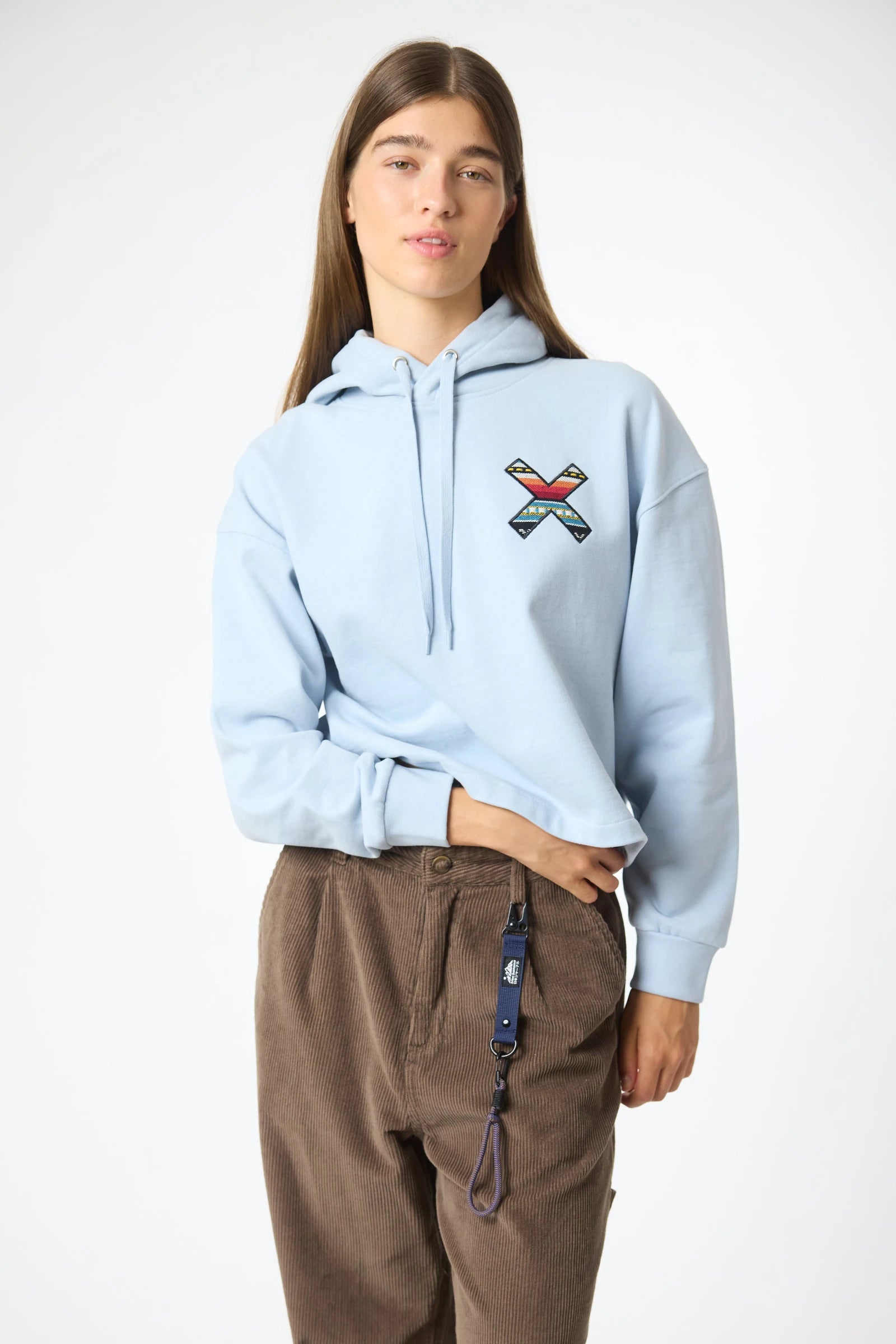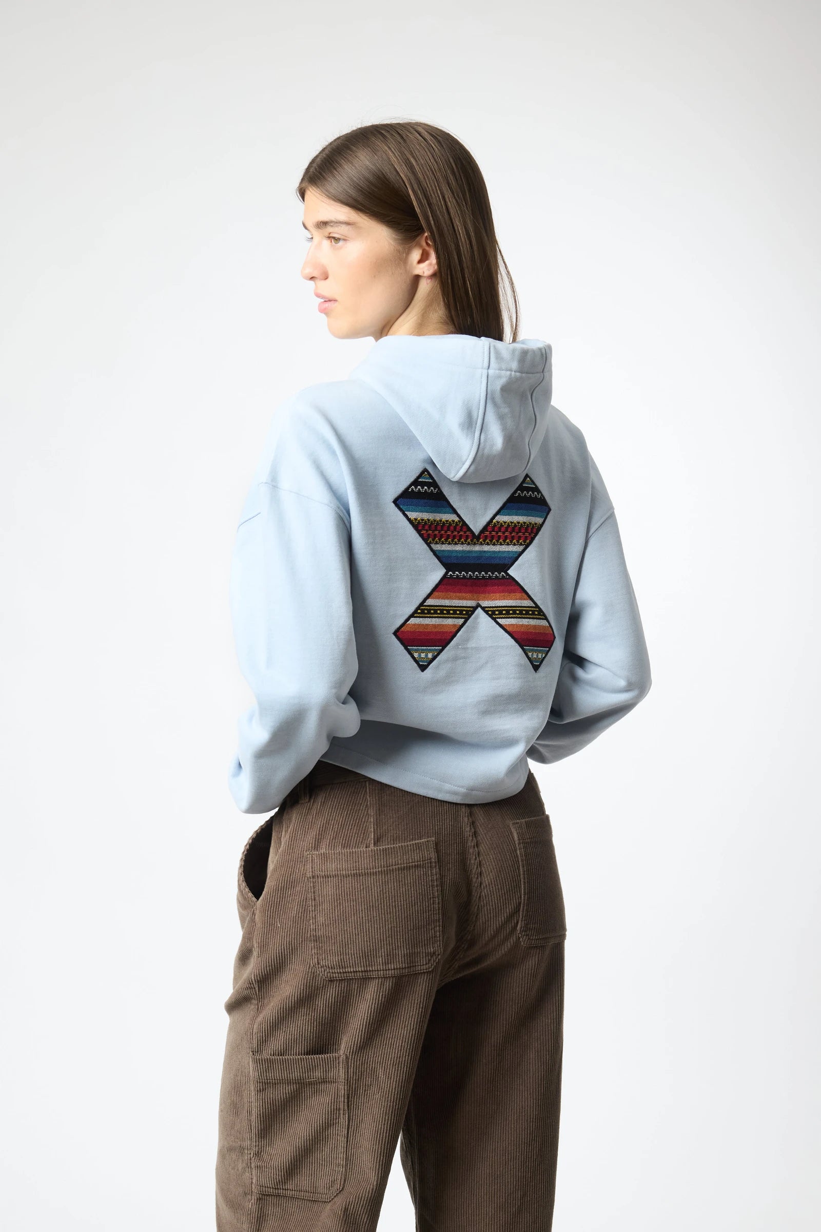 Sudadera con capucha con nuestra clásica X bordada: delantera en el pecho y trasera en la espalda. Confeccionada con algodón 100% orgánico y corte crop.