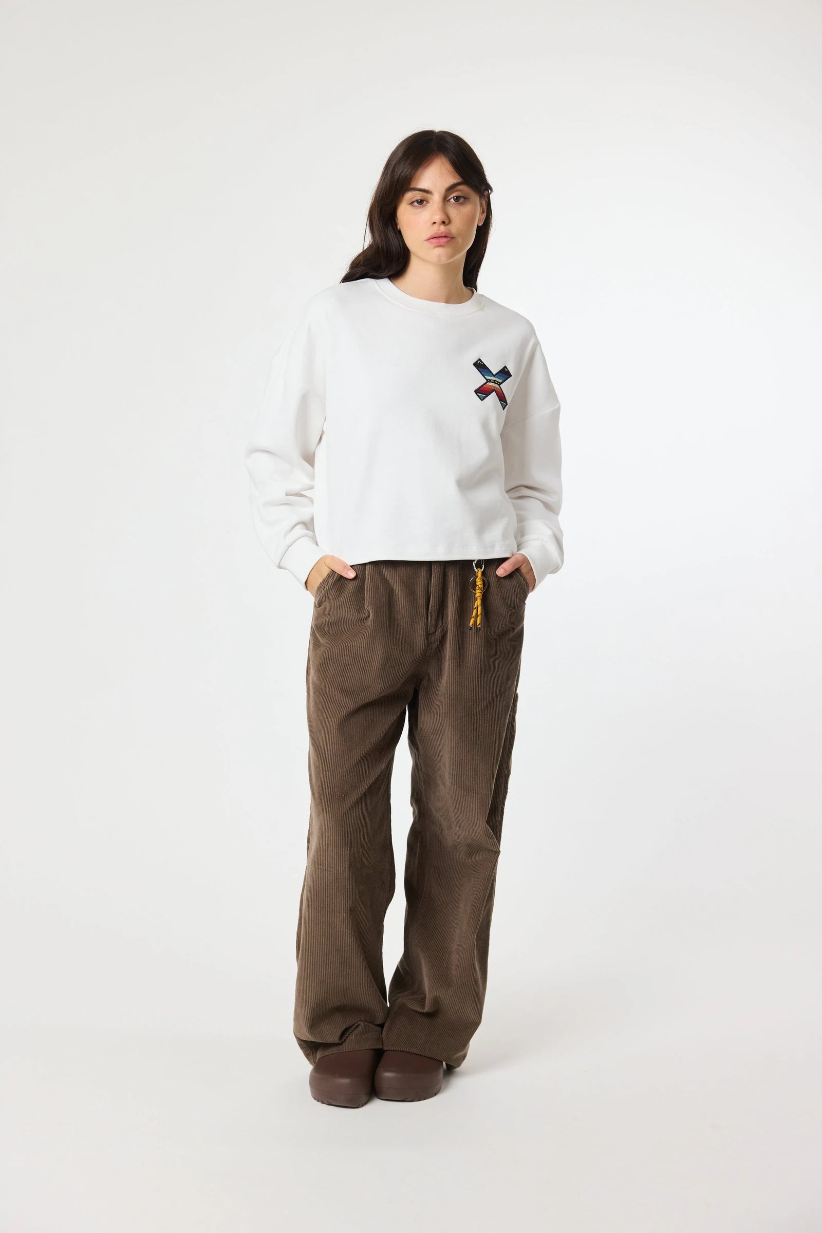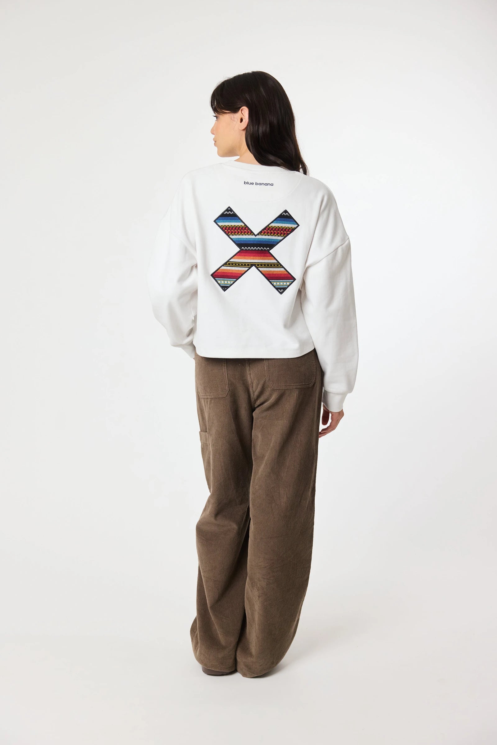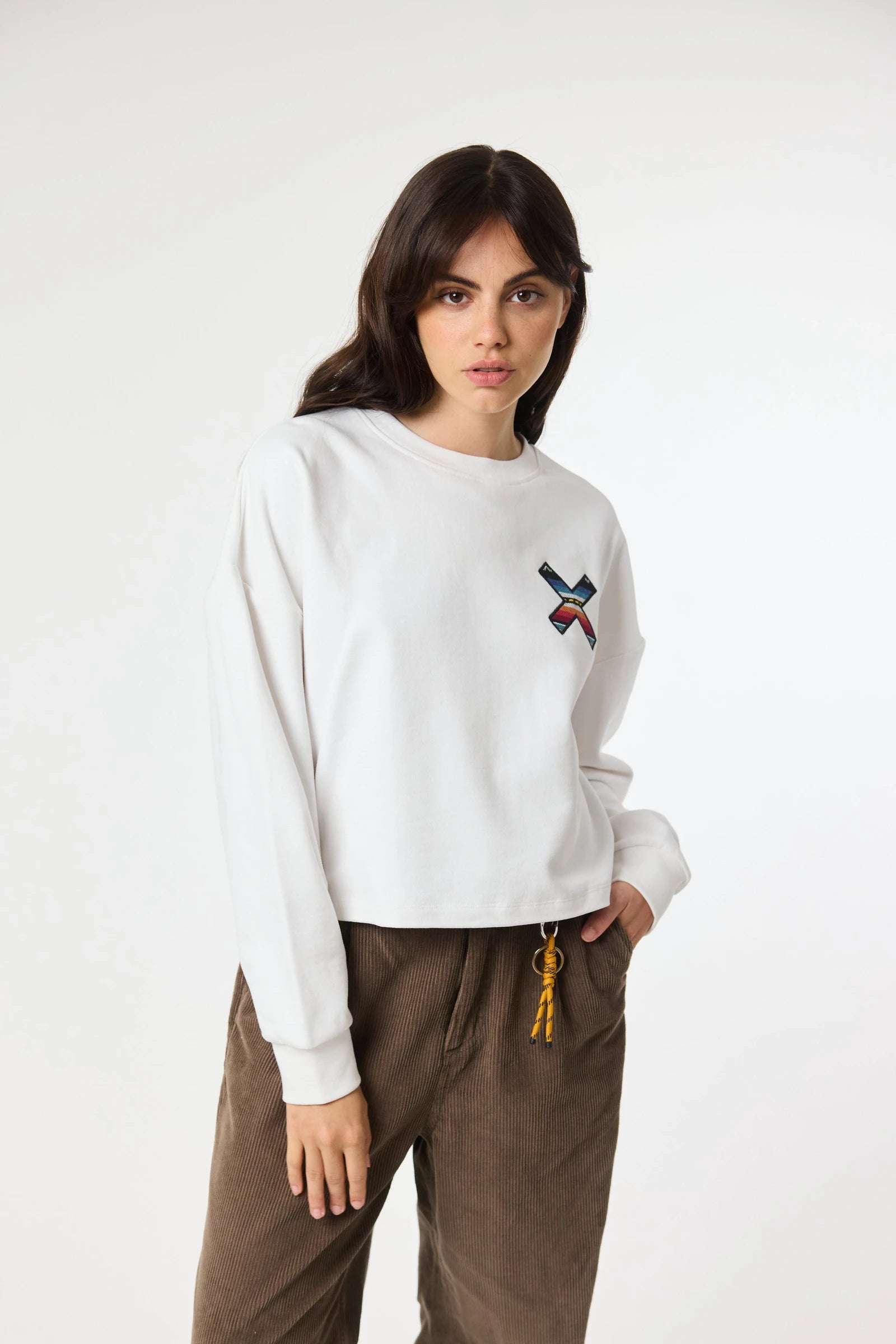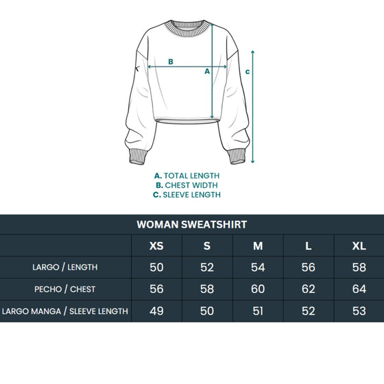 Sudadera con nuestra clásica X bordada: delantera en el pecho y trasera en la espalda. Confeccionada con algodón 100% orgánico y corte crop.