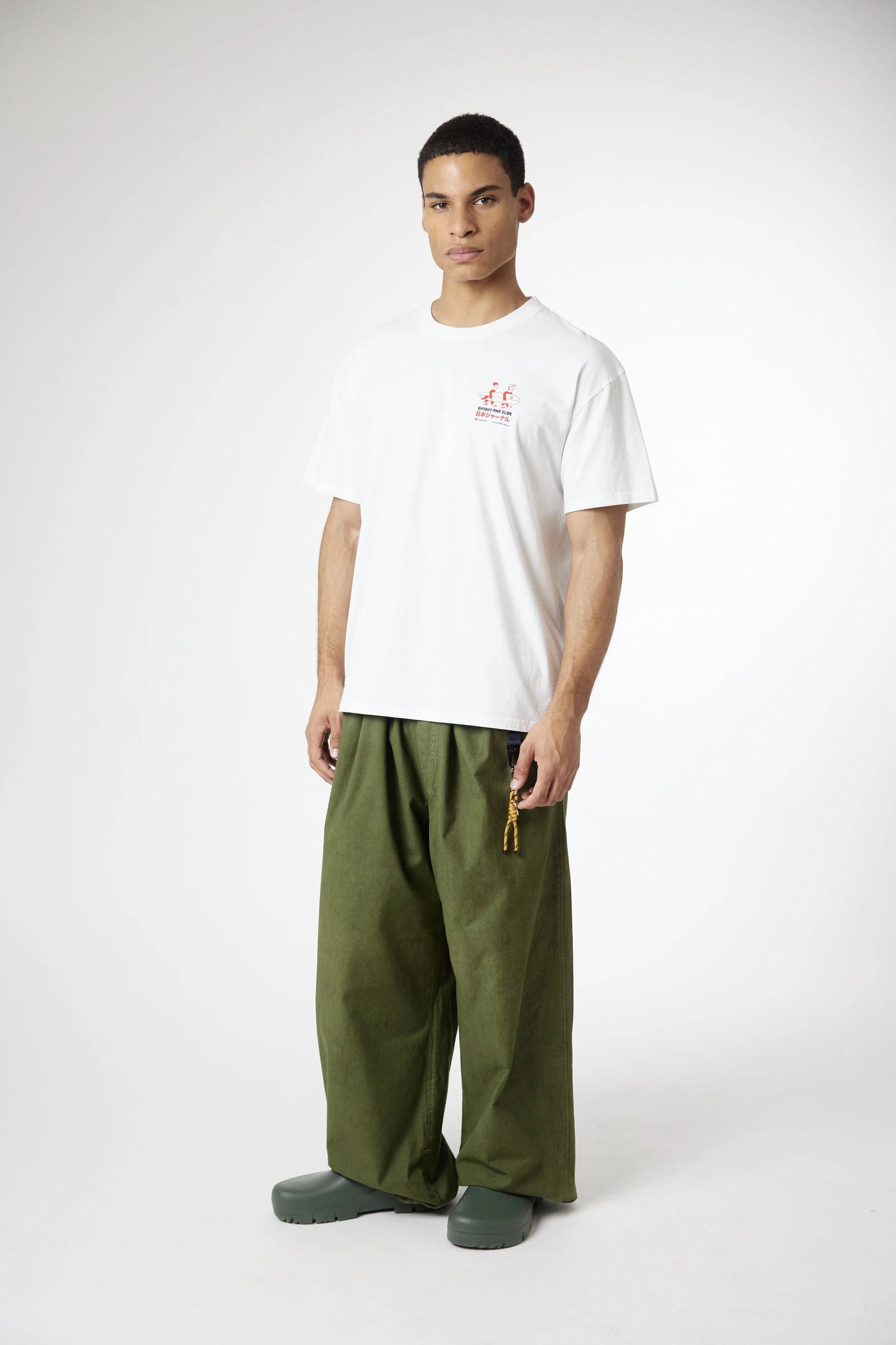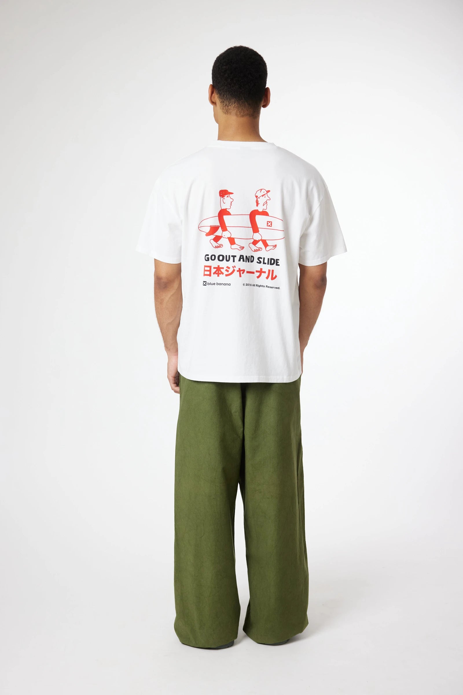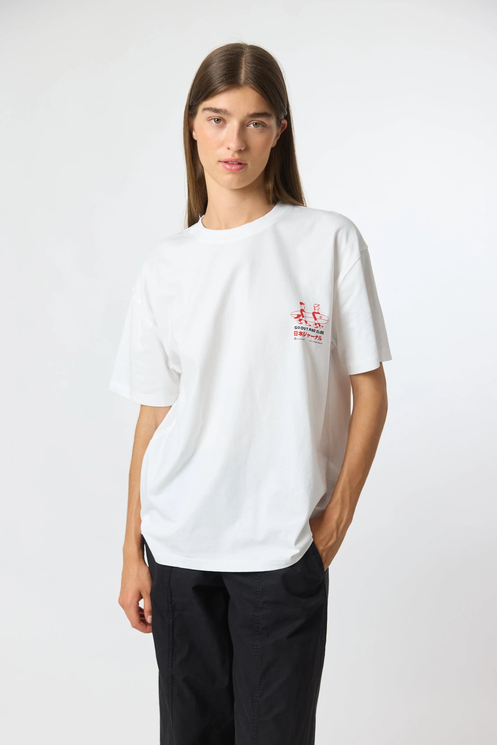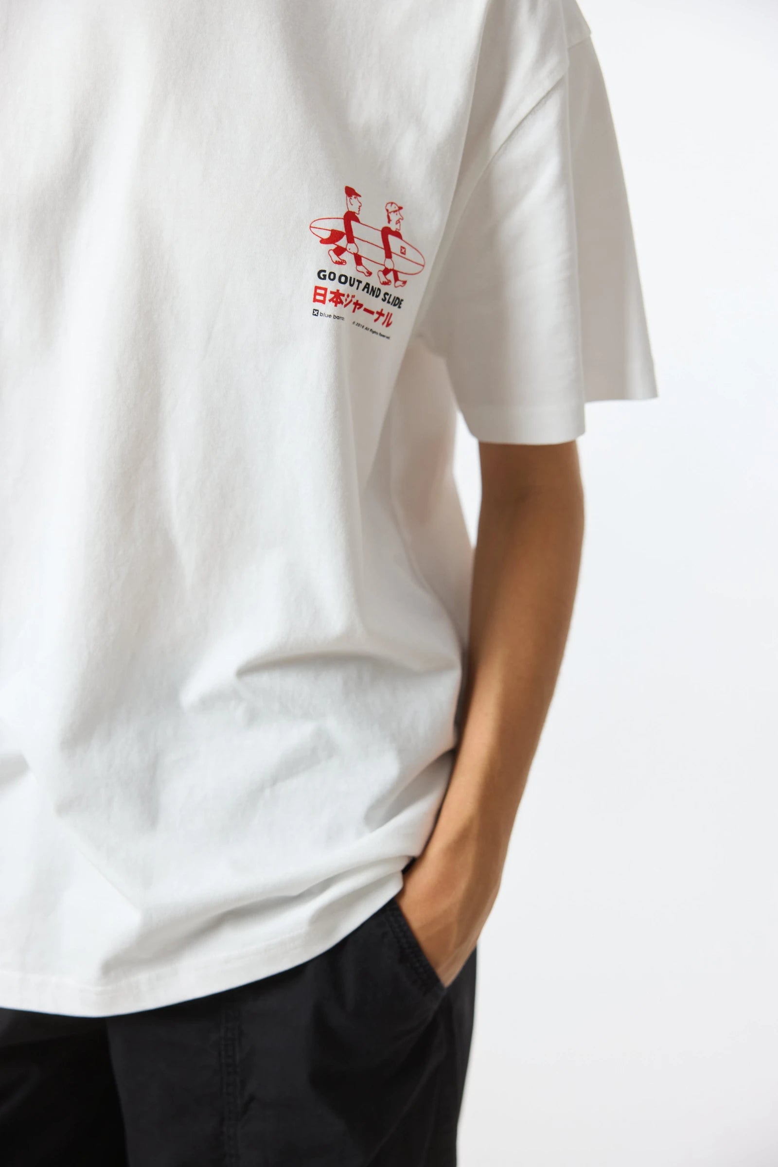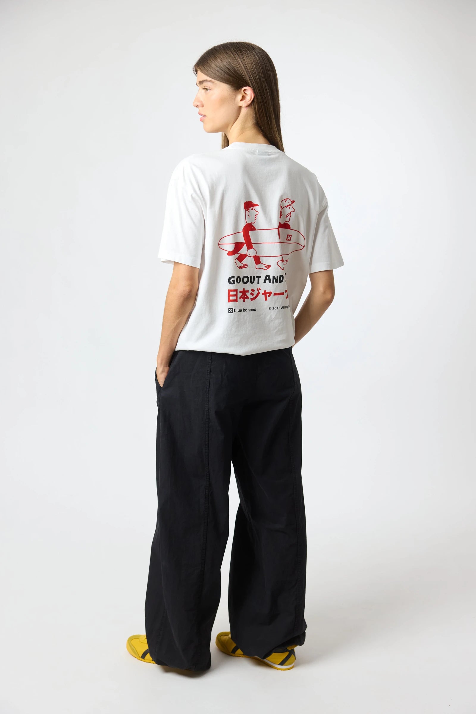 Camiseta con print delantero en el lateral superior izquierdo y print trasero central confeccionada con 100% algodón orgánico y corte oversize.