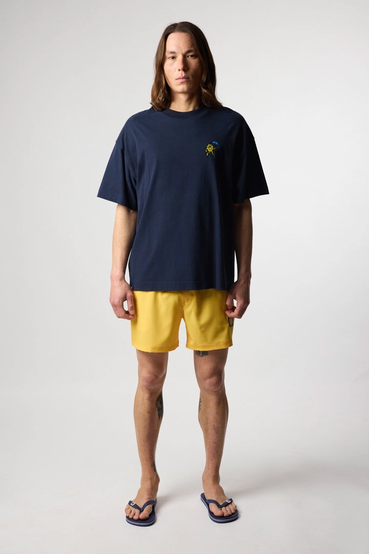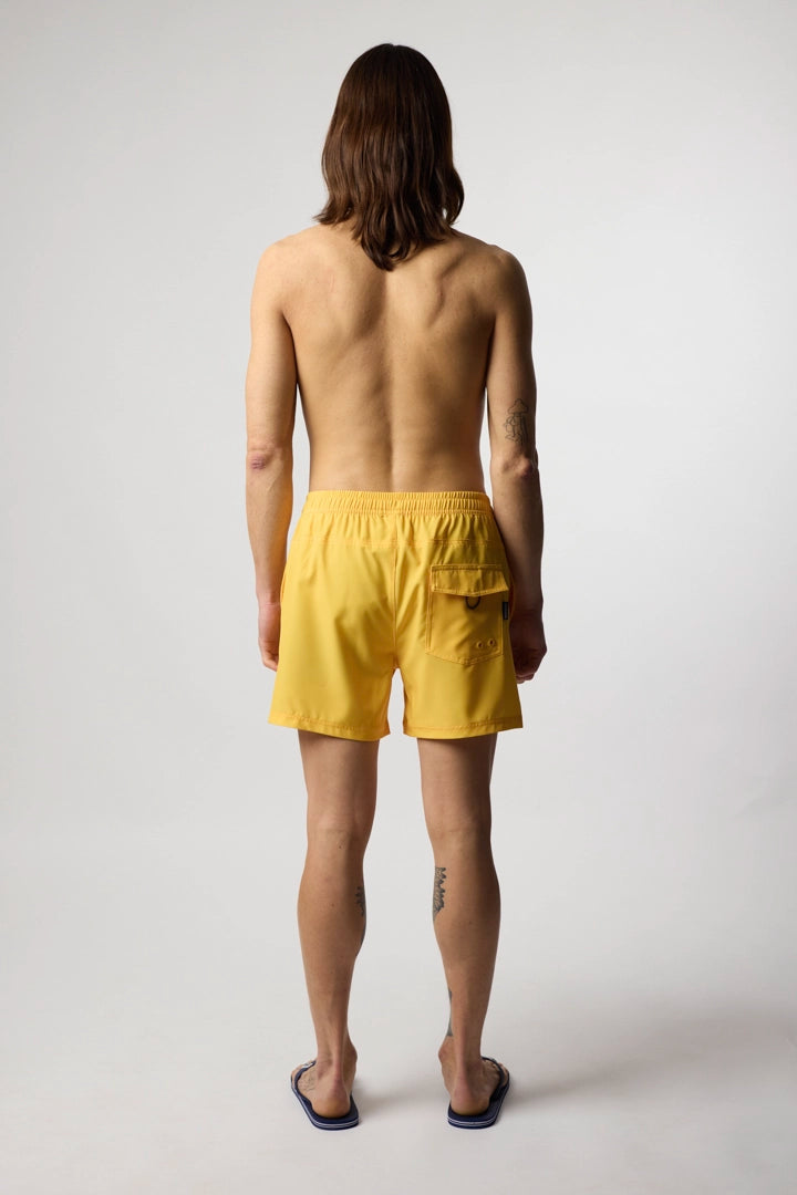 Bañador con efecto lavado y corte recto. Cintura elástica, cierre con cordón y herretes engomados. Parche bordado en la parte inferior derecha. Bolsillos laterales delanteros y bolsillo trasero en la parte superior derecha con solapa para el cierre.